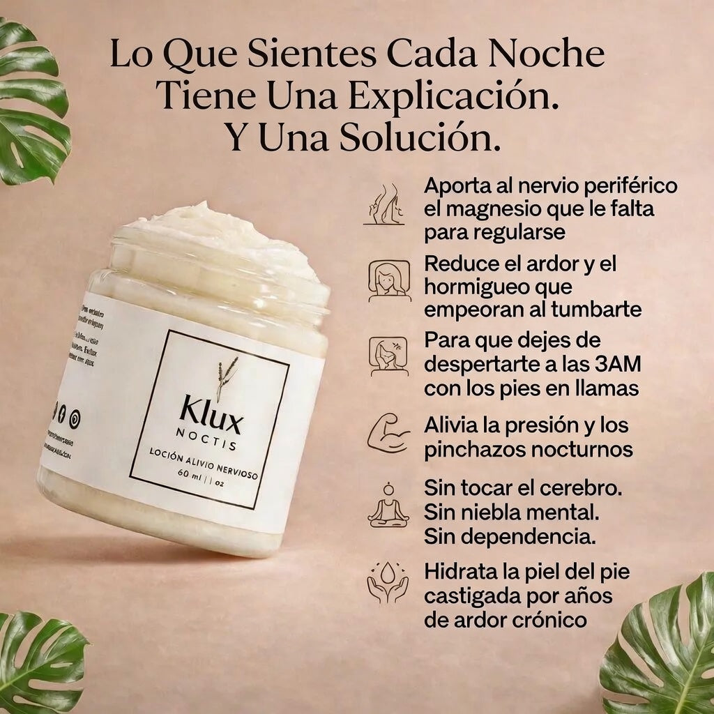 La loción Klux fue diseñada específicamente para aprovechar el poder del magnesio, que, según estudios, ofrece alivio y confort a quienes sufren molestias nerviosas. Cada ingrediente se selecciona cuidadosamente por sus propiedades únicas, creando una mezcla armoniosa que nutre, calma y revitaliza.